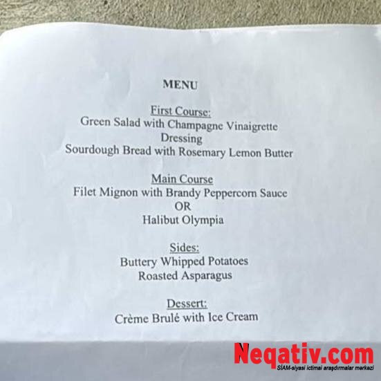Neqativ.com “İzvestiya” nəşrinə istinadən xəbər verir ki, siyasətçilərə ilk olaraq şampan sirkəli sous ilə yaşıl salat və rozmarin - limon yağlı xüsusi çörək təqdim olunacaq.