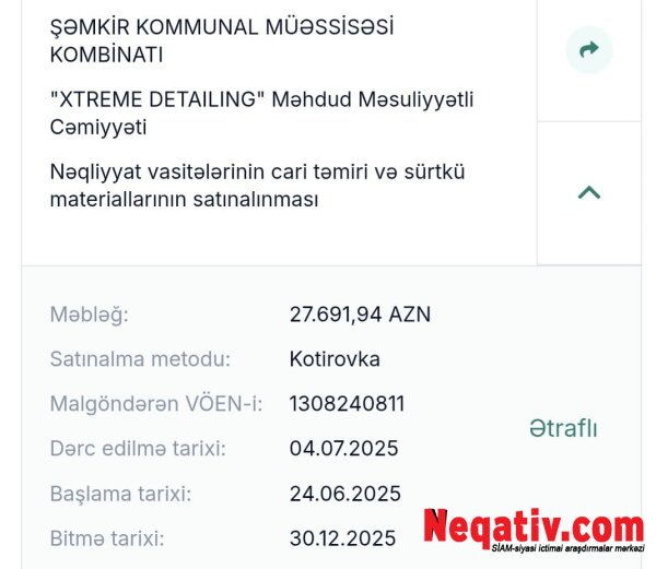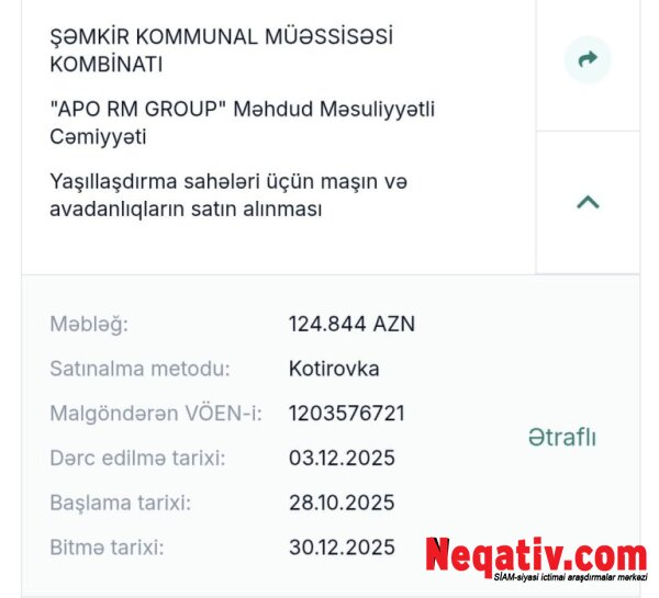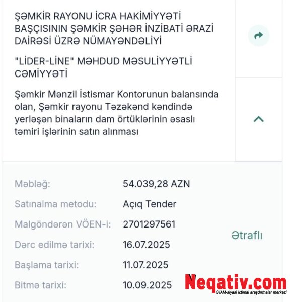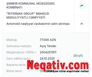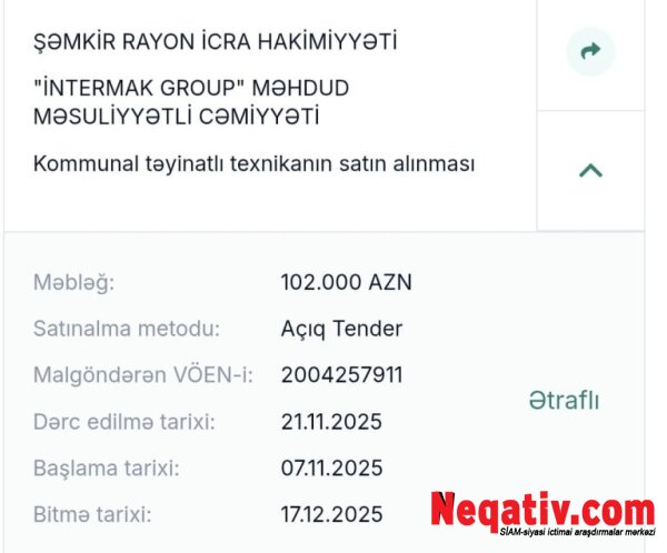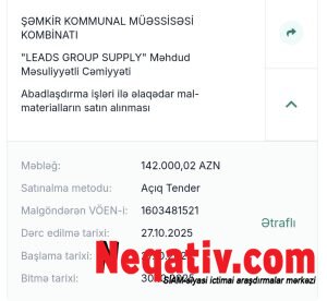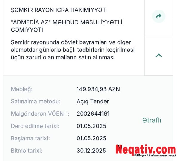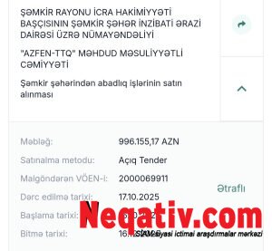 Hesablama Palatası, Maliyyə Nazirliyi və aidiyyəti orqanlara müraciət edərək, Şəmkir Rayonuna son bir ildə Tenderlərin maliyyəsi yoxlanılsın. Mövzuya qayıdacayıq. Şəmkir Rayonun 2025 ci ildə əldə etdiyi Tenderləri təqdim edirik.