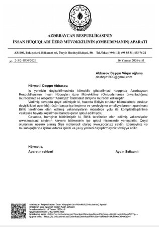 1. Omudsman Aparatı – müraciətə cavab verib.
