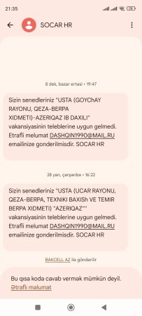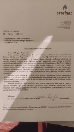 2. “Azəriqaz” İstehsalat Birliyi / SOCAR – baş direktor cənab Azər Məmmədova edilmiş müraciətlər cavablandırılıb, lakin iş yerinin dəyişdirilməsi ilə bağlı konkret həll təklif edilməyib.