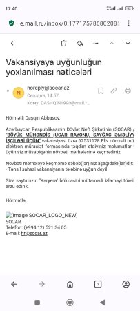 Böyük mühəndis vəzifəsi: müraciət təhsilin uyğun olmaması səbəbi ilə rədd edilmişdir".